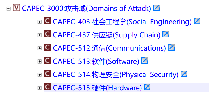 类别(Category) | 是基于某些常见特征的攻击模式的集合, 是基于效果/意图的攻击模式聚合, 聚合元攻击模式。 基于效果/意图的聚合不是可操作的攻击,因此不是一种攻击行为模式, 它是基于一些常见标准的一组模式。 |
