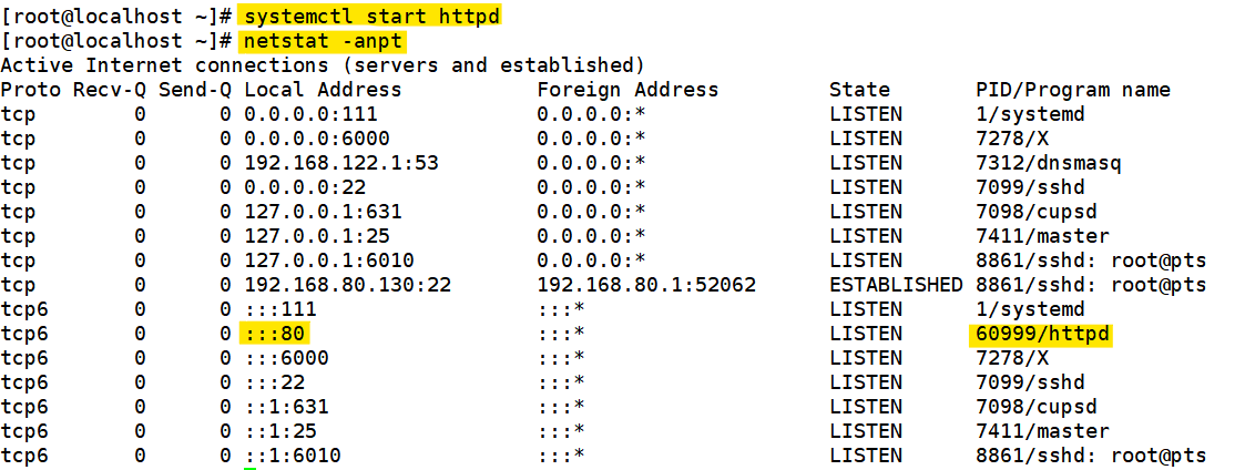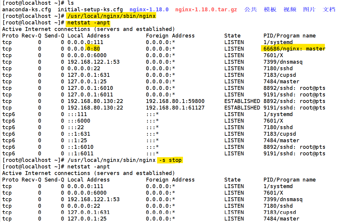 检验Nginx有没有安装成功:(启动Nginx查看端口,再停止Nginx)