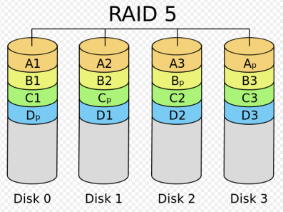 补充:校验信息位置不一样是分摊存校验信息的压力。坏一块通过奇偶信息可以算出另外一块盘的信息,坏两块就找不回数据。
