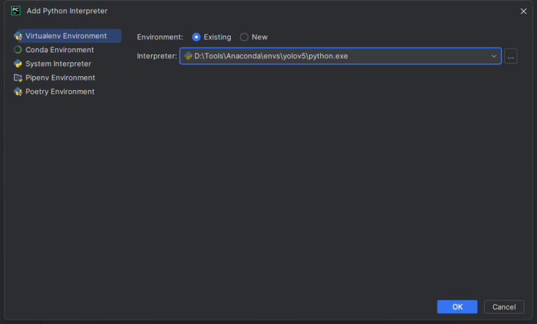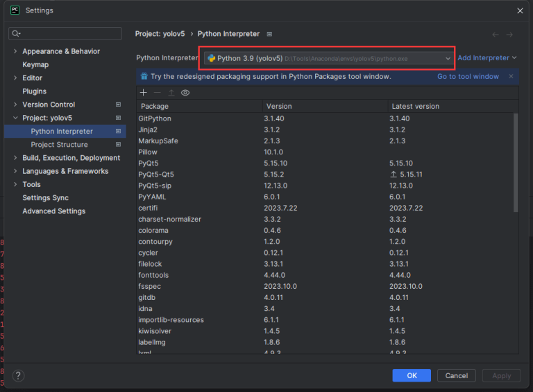 找到Python Interpreter,修改为我们在Anaconda自行创建的yolov5的虚拟环境。