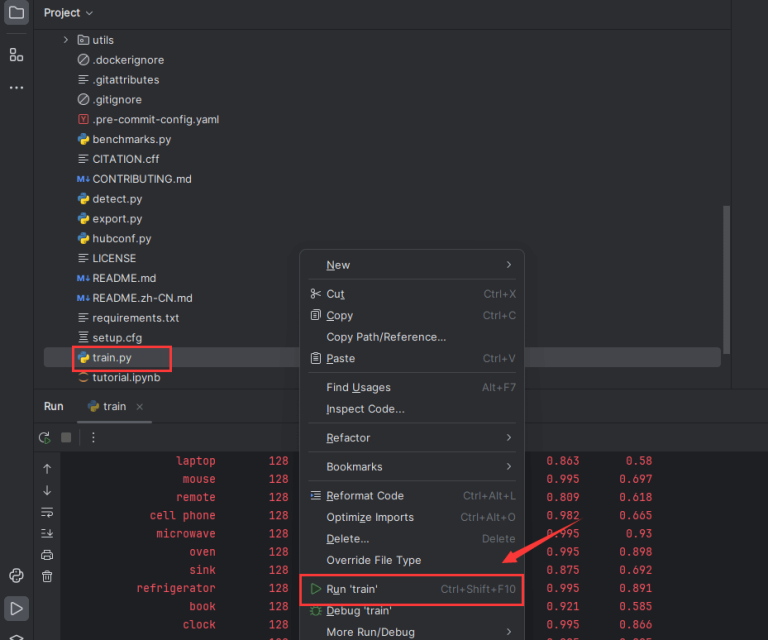 右键train.py,点击run运行。