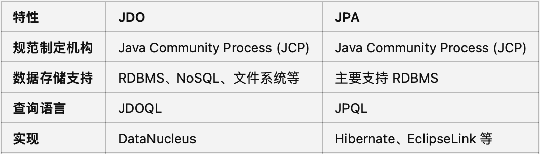 • JDO 是持久化 API 的标准规范,而 DataNucleus 是其具体实现之一。