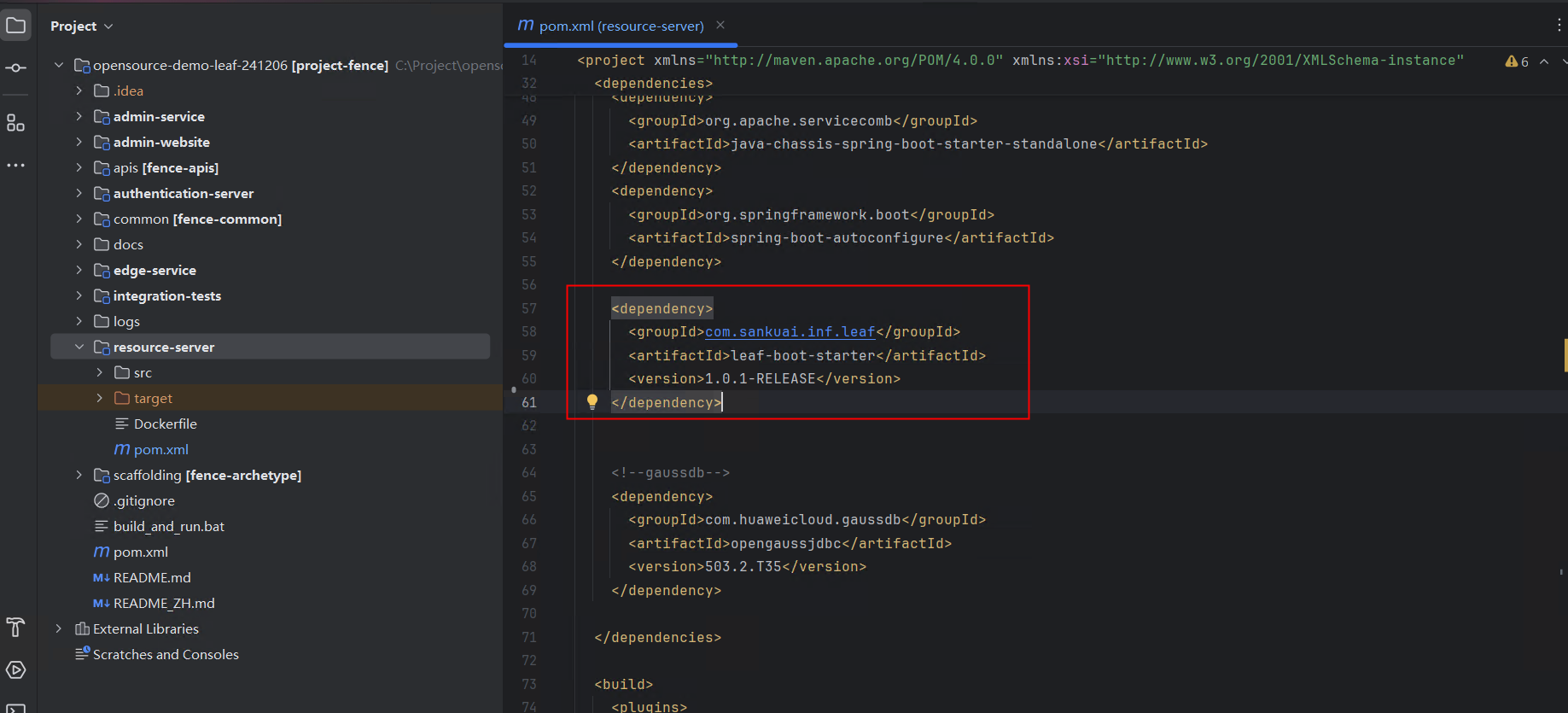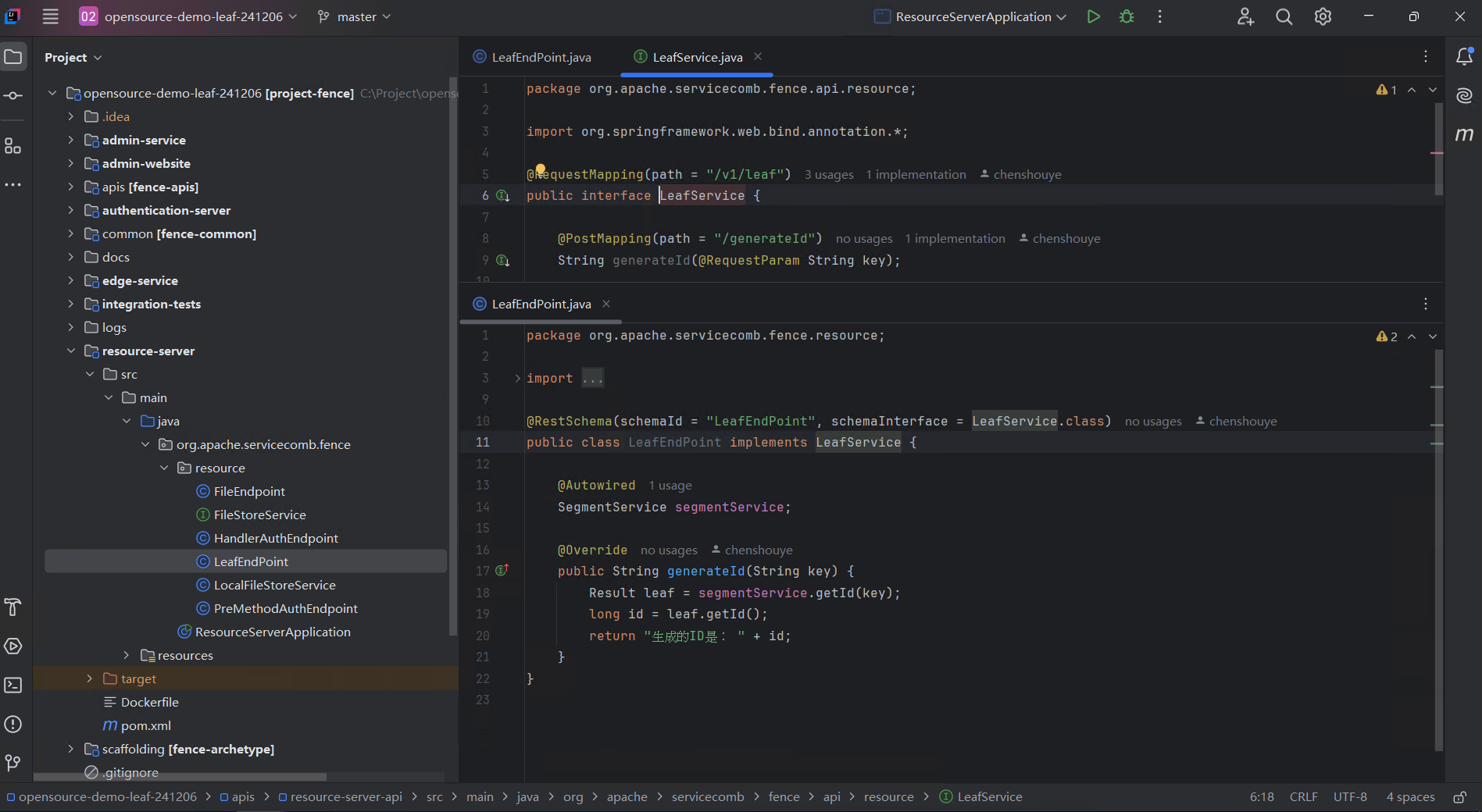 - 打包leaf-boot-starter,集成到servicecomb-fence/resource中