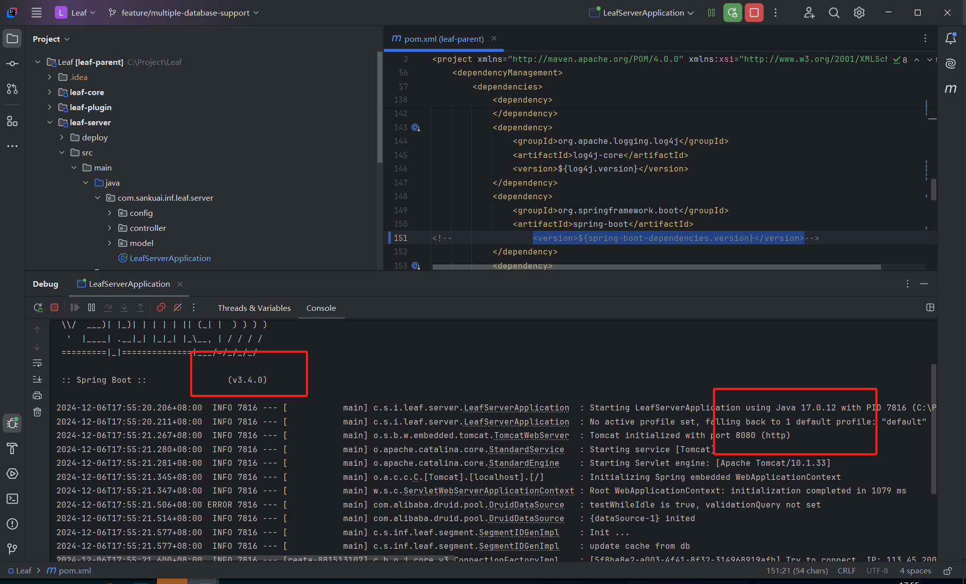 因为要支持多数据库,所以驱动引用都提取到leaf-server中,leaf-core中保留mysql驱动的scope为test做单元测试。这里如果大家只使用一种数据库只依赖修改驱动即可,我这里要扩展多数据支持同时构建镜像后续上架镜像仓库方便用户使用,需要依赖多种数据库依赖。对于leaf-boot-starter来说,不引入相关数据库依赖,而在具体的项目中使用时候引入具体数据库依赖。