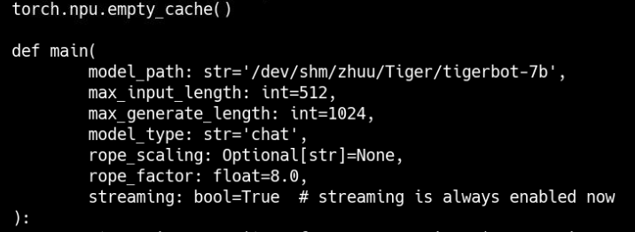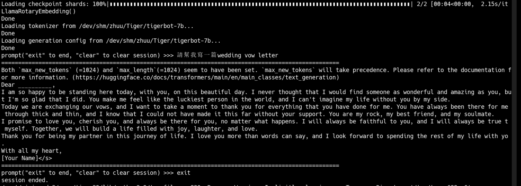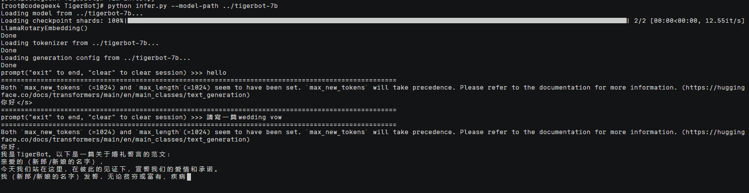 python infer.py --model-path ../tigerbot-7b #注意將後面的模型路徑替換為自己本地路徑
