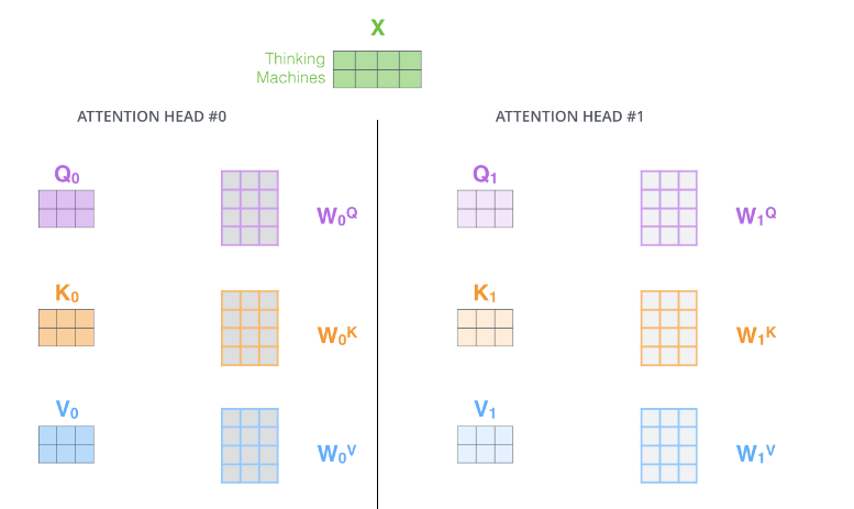 论文还提出了Multi-Head Attention的概念。其实很简单,前面定义的一组Q、K和V可以让一个词attend to相关的词,我们可以定义多组Q、K和V,它们分别可以关注不同的上下文。计算Q、K和V的过程还是一样,不过现在变换矩阵从一组(𝑊𝑄,𝑊𝐾,𝑊𝑉)变成了多组(𝑊𝑄0,𝑊𝐾0,𝑊𝑉0) ,(𝑊𝑄1,𝑊𝐾1,𝑊𝑉1)。如下图所示。