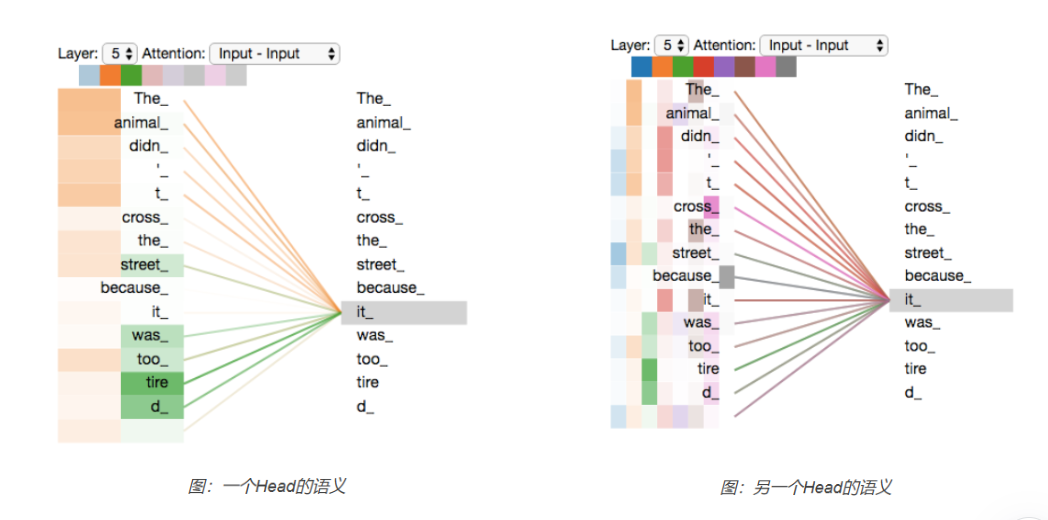 从上面两图的对比也能看出使用多个Head的好处——每个Head(在数据的驱动下)学习到不同的语义。