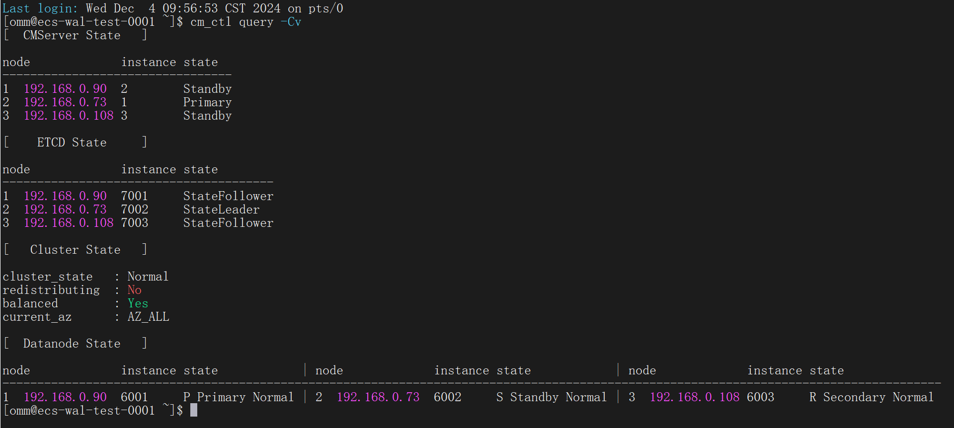 使用3_nodes_centralized_1primary_1standby_1logger.json一主一备一日志模板初始安装完成数据库后, 数据库状态如下,服务器ecs-wal-test-0001为主,ecs-wal-test-0002为备,ecs-wal-test-0003为日志