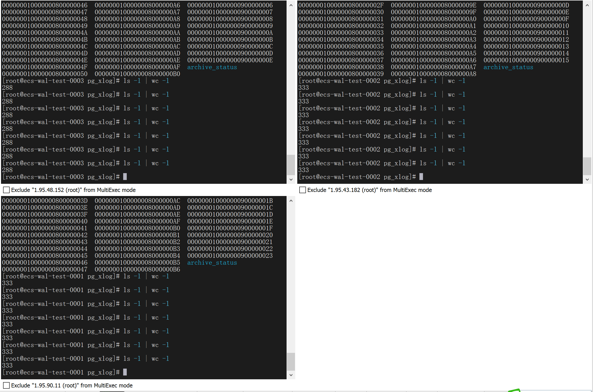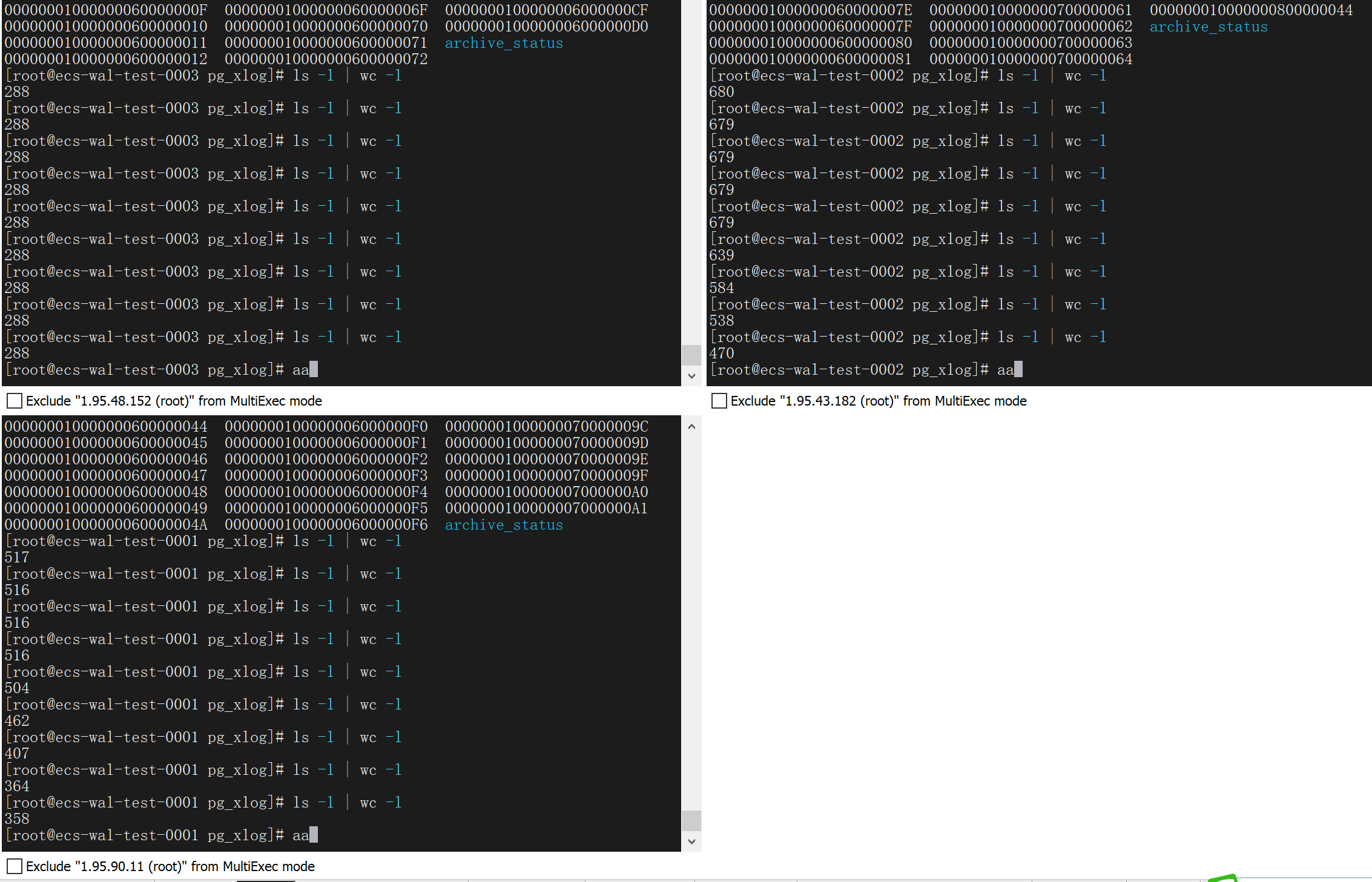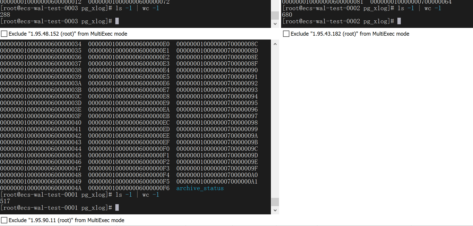 从图中可以看到,主机上wal文件个数已经变成57,第一备机也增涨到35个,日志备机成了7个。