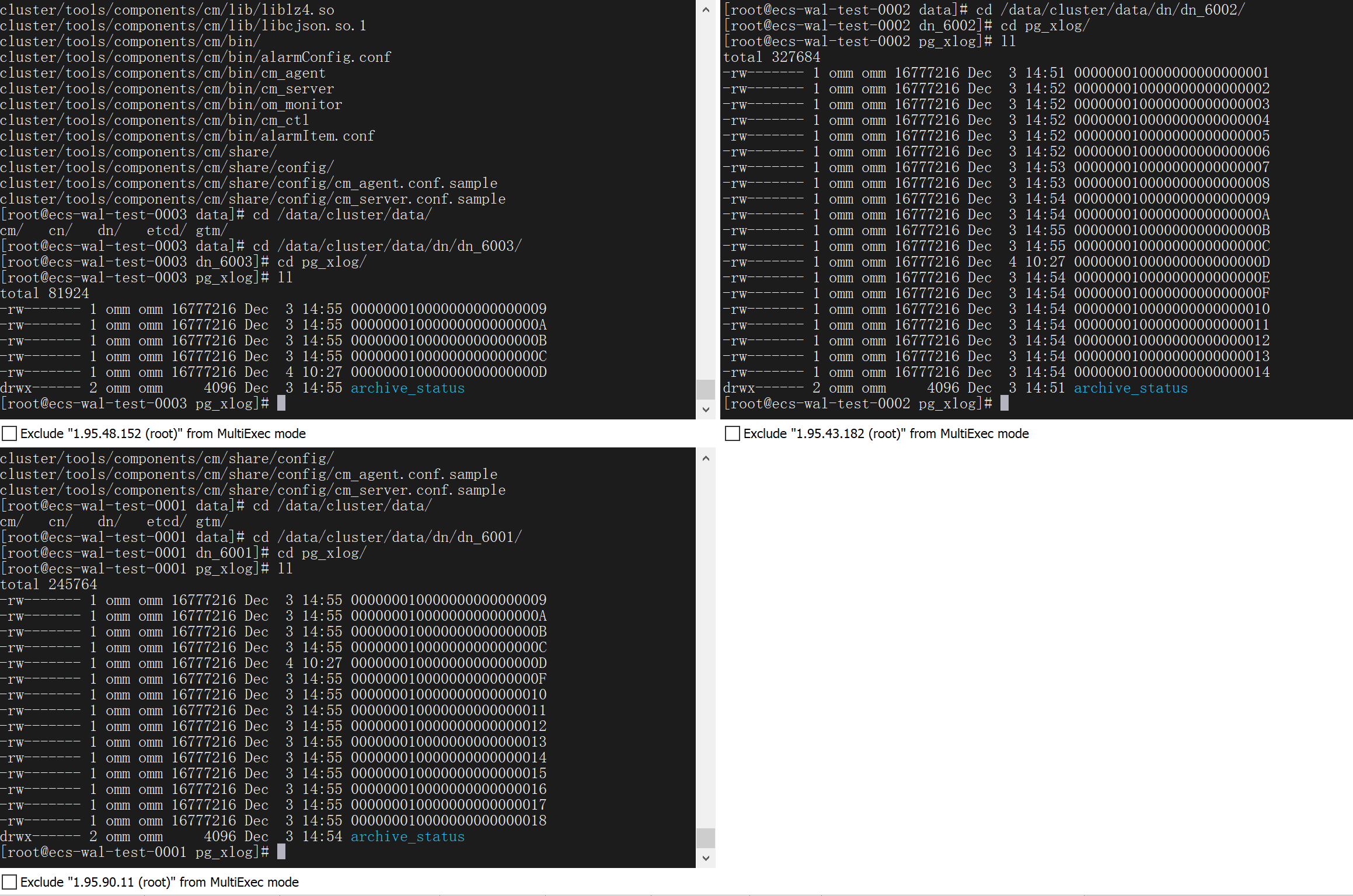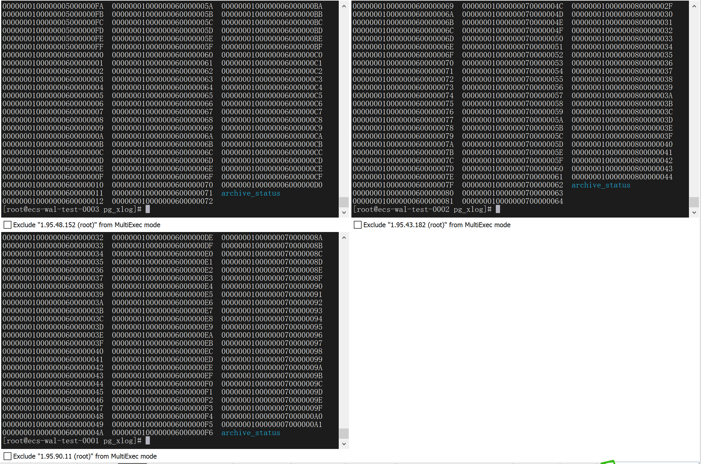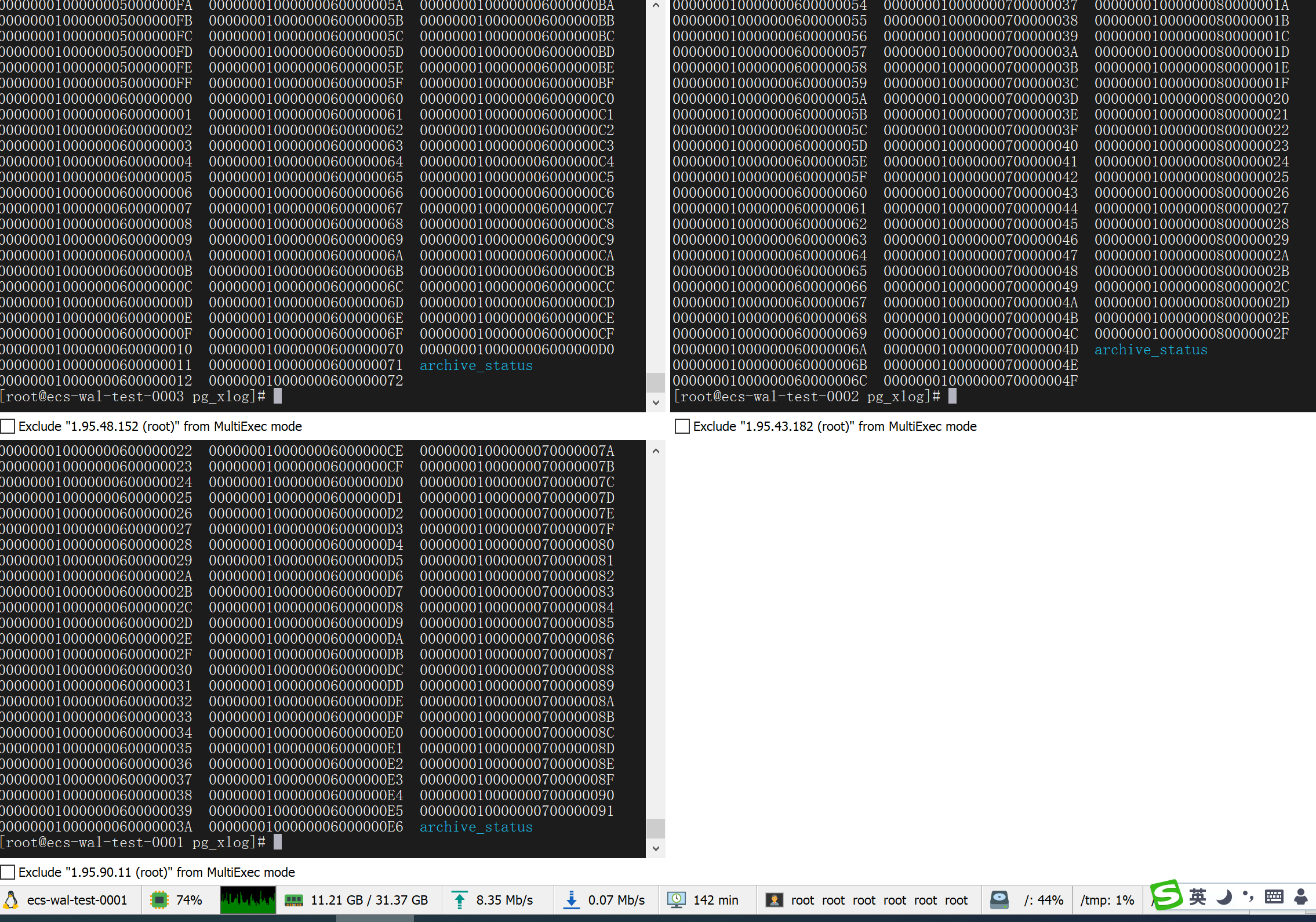 从图中可以看到,主机上wal文件个数已经变成57,第一备机也增涨到35个,日志备机成了7个。