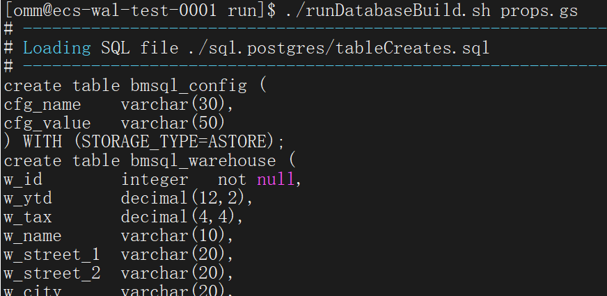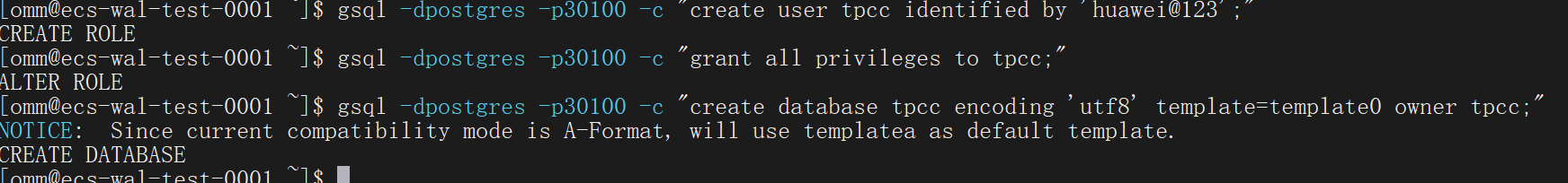 [omm@ecs-wal-test-0001 ~]$ gsql -dpostgres -p30100 -c "create database tpcc encoding 'utf8' template=template0 owner tpcc;"