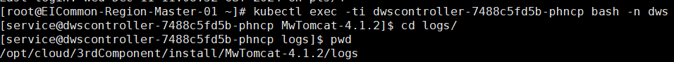根据上一步骤中获取的去掉前缀的server_hostname名称,使用K8s命令 kubectl exec -ti {容器名称} bash -n dws 登录dwscontroller-7488c5fd5b-phncp容器,并进入到日志目录查看日志文件ossres-dws.log