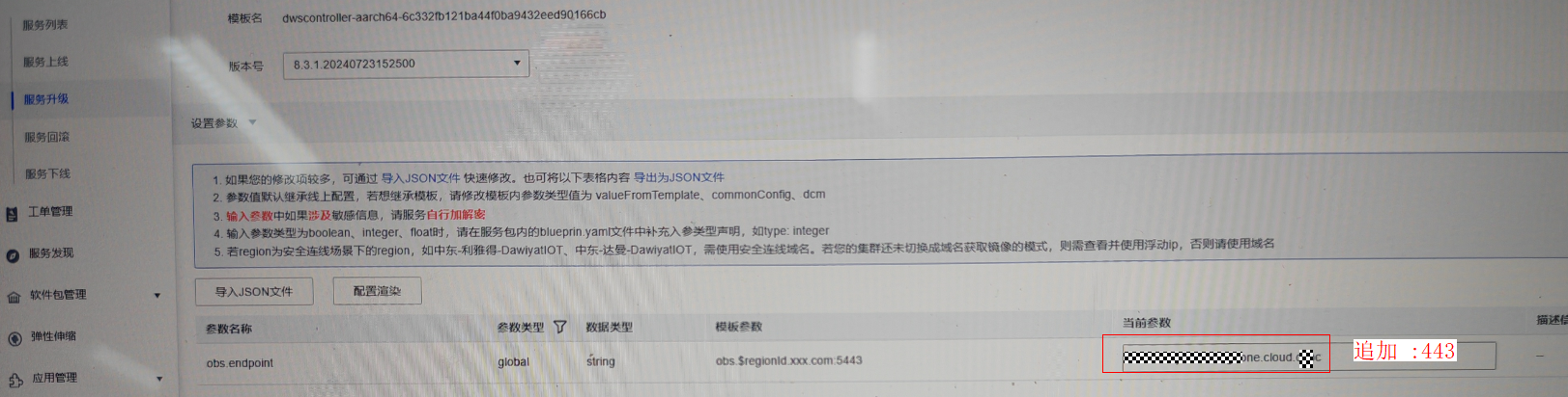 修改方法:登录cloudscope->CDK->变更管理 升级->选dwscontroller->下一步->参数列表搜obs.endpoint,追加 :443 (同时修改liveness参数+1或-1,使修改参数生效)