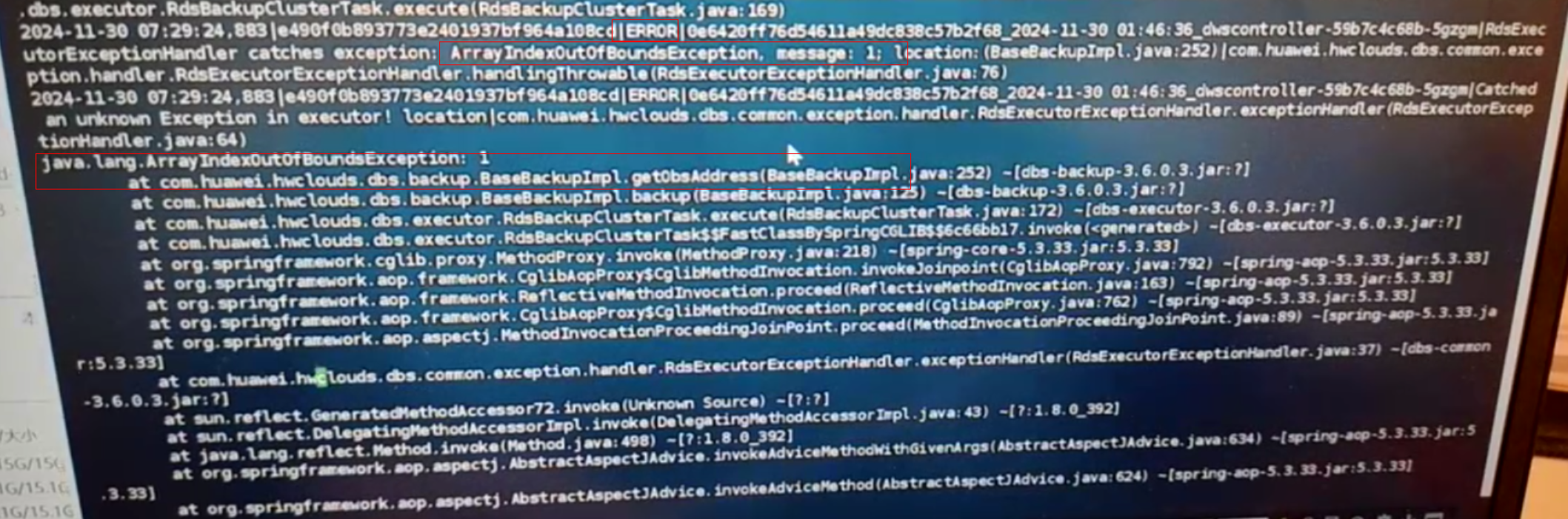 使用grep {backJobId} ossres-dws.log 或 grep {backJobId} ossres-dws.log | grep ERROR 查看报错日志,如果报错日志不够明显,也可以vi进入到日志文件,并根据backJobId查看是否有错误堆栈