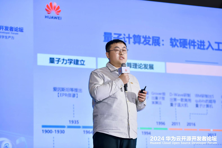 中国科学技术大学博士吴军以《量子遇上机器学习:基于MindSpore Quantum的量子机器学习算法实现》为题进行分享,他追溯了量子计算的起源,介绍了量子计算的基本原理和现代应用场景,如量子加密、量子模拟等,以此作为引入,为大家揭开了量子计算的神秘面纱。他深入讲解了MindSpore Quantum量子计算框架的基本概念,该框架结合HiQ高性能量子计算模拟器和昇思MindSpore的分布式并行与自动微分等能力,提供极简开发模式和极致性能体验,可高效处理量子机器学习、量子化学模拟等问题,为科研者提供快速设计和验证量子算法的平台,让量子计算触手可及。他强调,量子计算不仅是一个新兴的计算范式,也将是可以从计算理论角度解决后摩尔时代难题的有力工具。