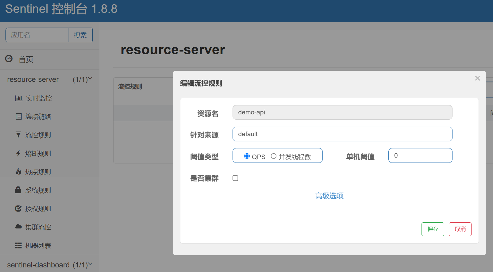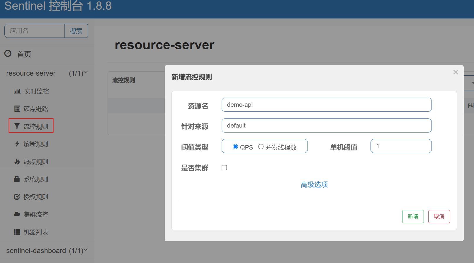 - 进入sentinel-dashboard后,会发现左侧列表多了一个resource-server的应用,为其添加流控规则