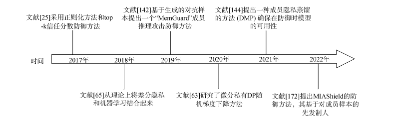 针对成员推理攻击,也有一些防御方法可以采取。下图是是针对成员推理攻击的防御发展历程: