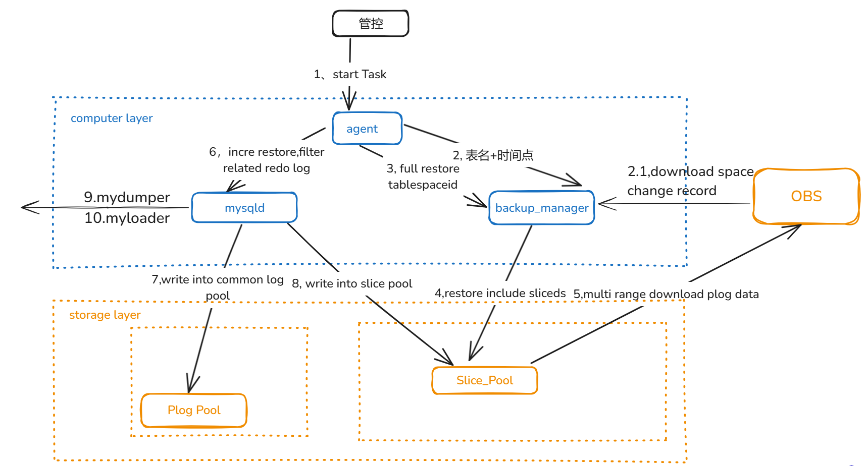 • 全量恢复会根据表tablespace id获取要恢复的slice列表,下发恢复任务到存储侧,恢复指定plog;