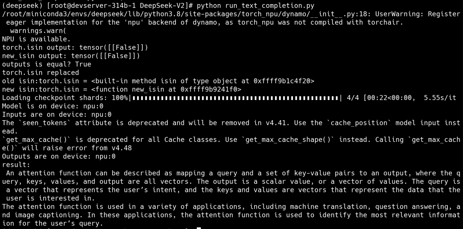 - DEMO内容:基于torch、torch_npu和transformer框架,使用deepseek-V2预训练模型,实现文本补全功能。