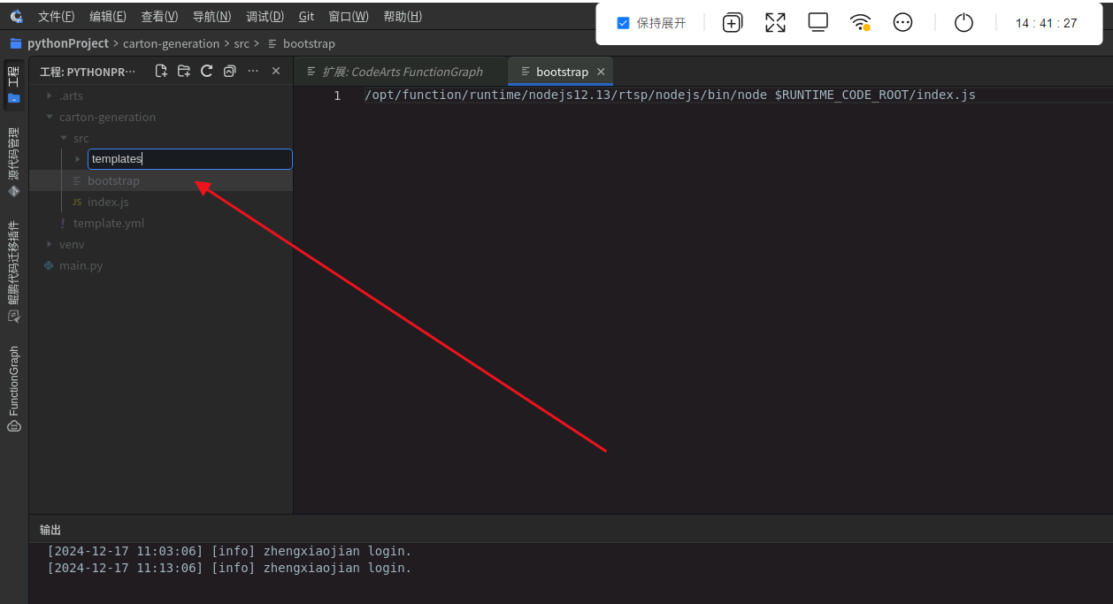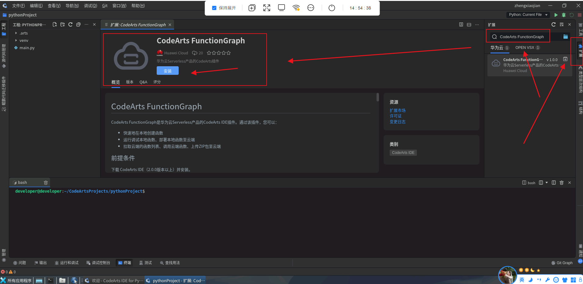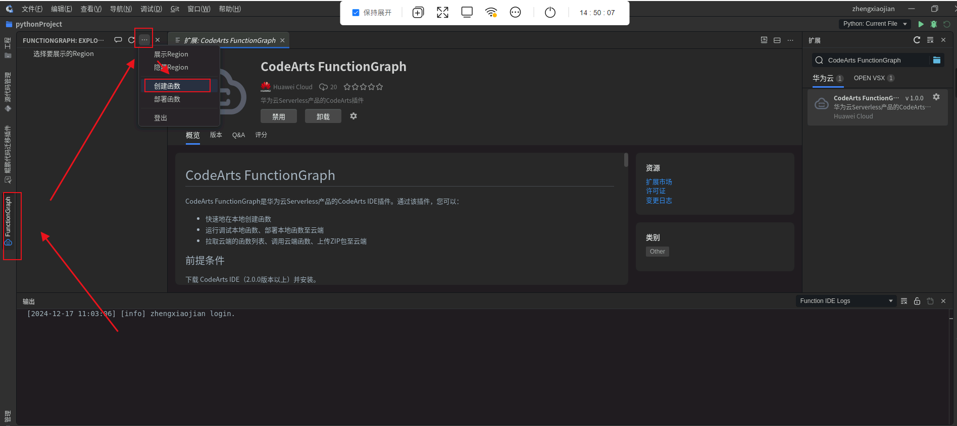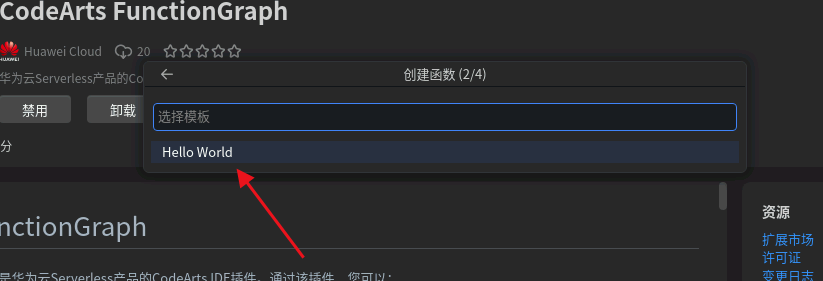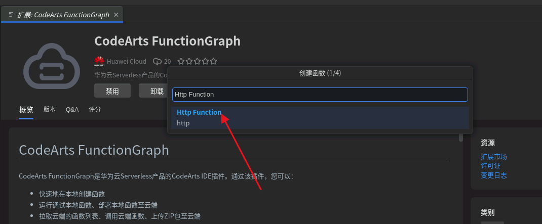 安装FunctionGraph插件: 点击右侧“扩展”搜索“CodeArts FunctionGraph”点击安装该插件。