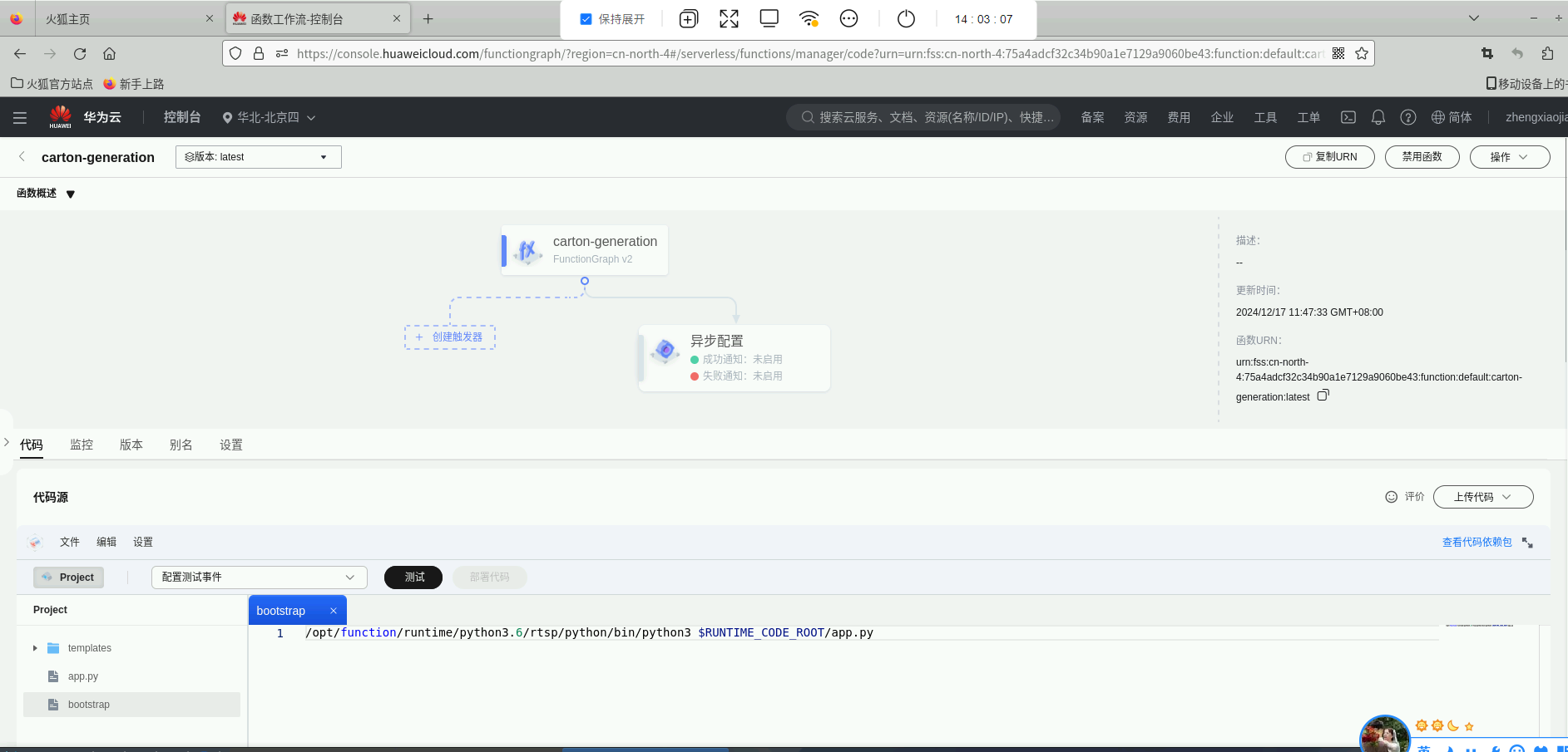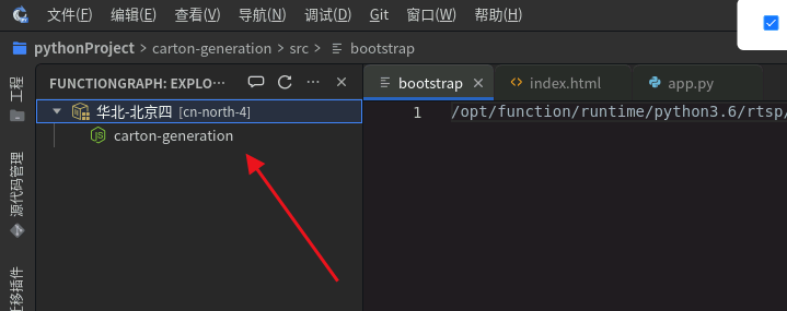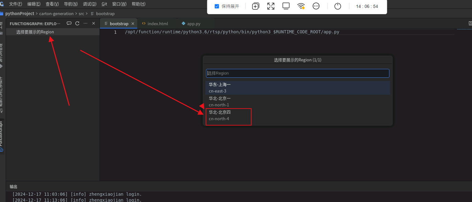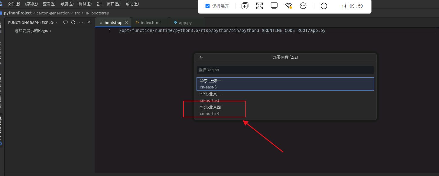 点击“选择要展示的Region”,选择“华北-北京四”,可以看到该区域下刚部署好的函数: