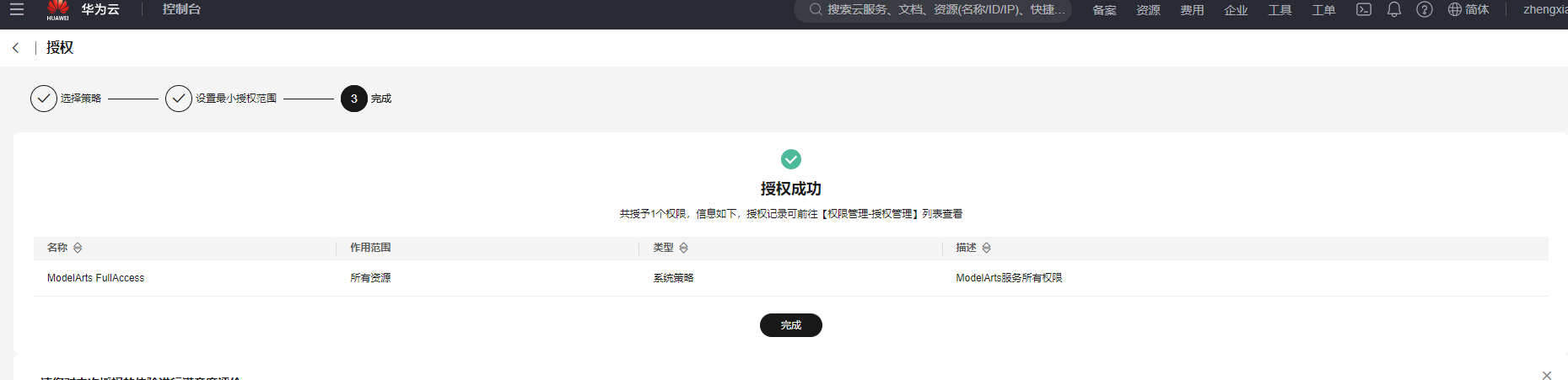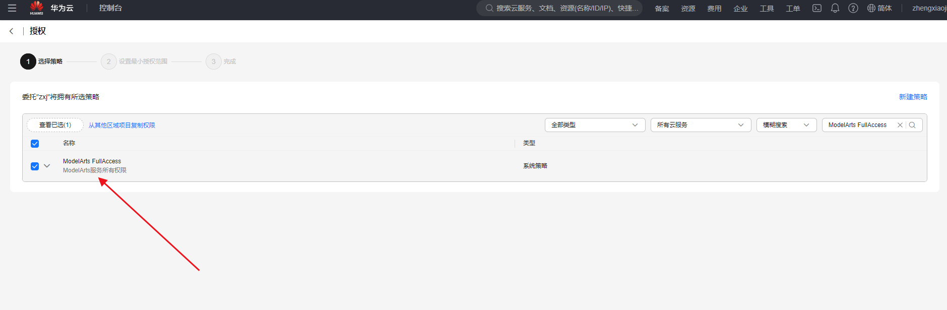 配置权限:配置权限,选择ModelArts FullAccess(这里可以直接搜索)。