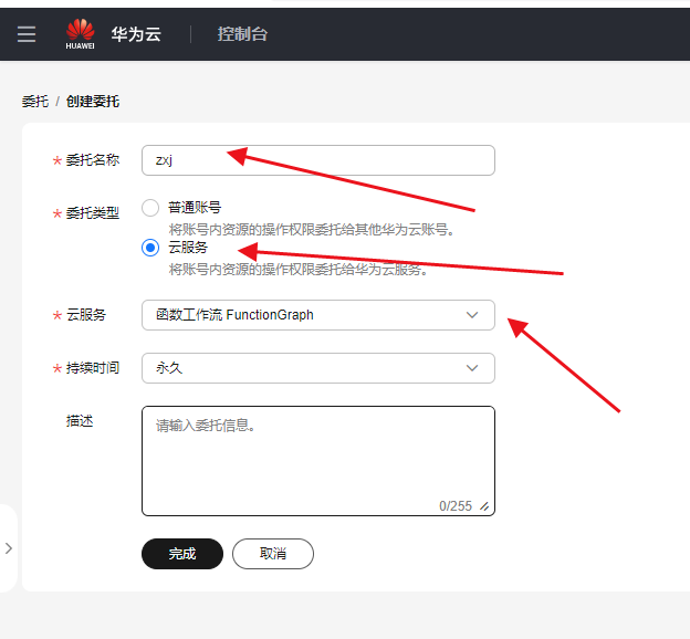 输入委托名称、委托类型选择“云服务”、云服务选择“函数工作流FunctionGraph”。
