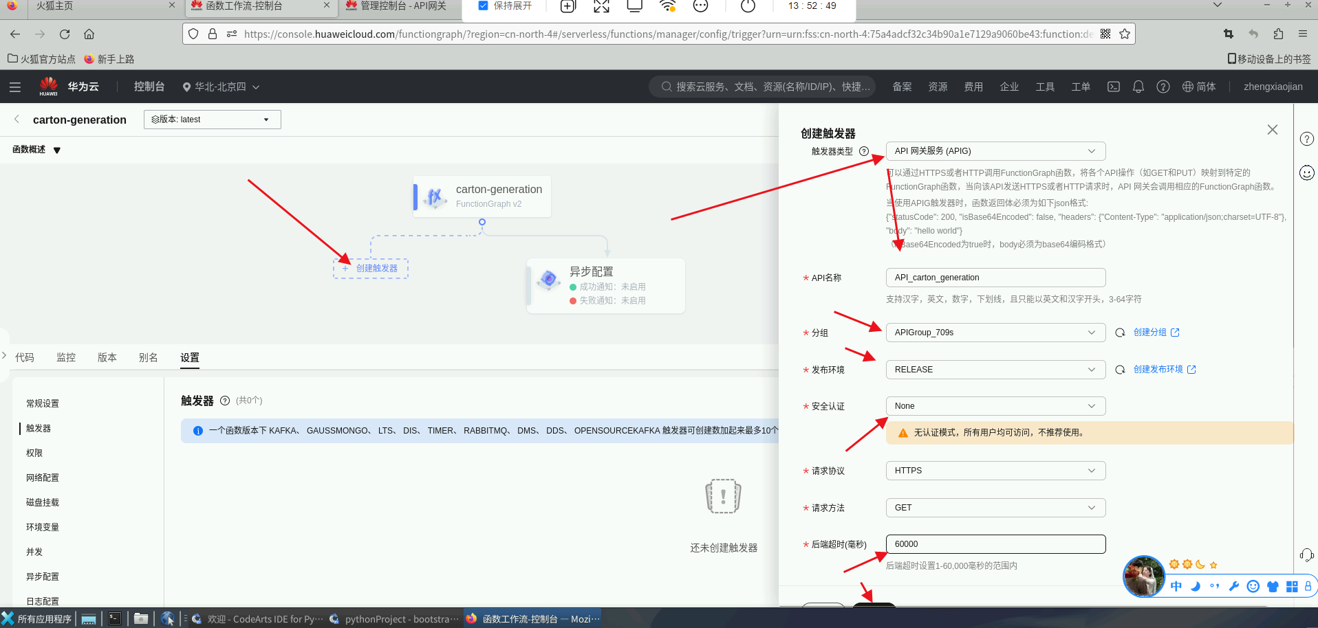 函数配置触发器: 点击“创建触发器”,选择“触发器类型”,选择“分组”(如果没有分组需先创建),选择“安全认证”,设置“后端超时”。