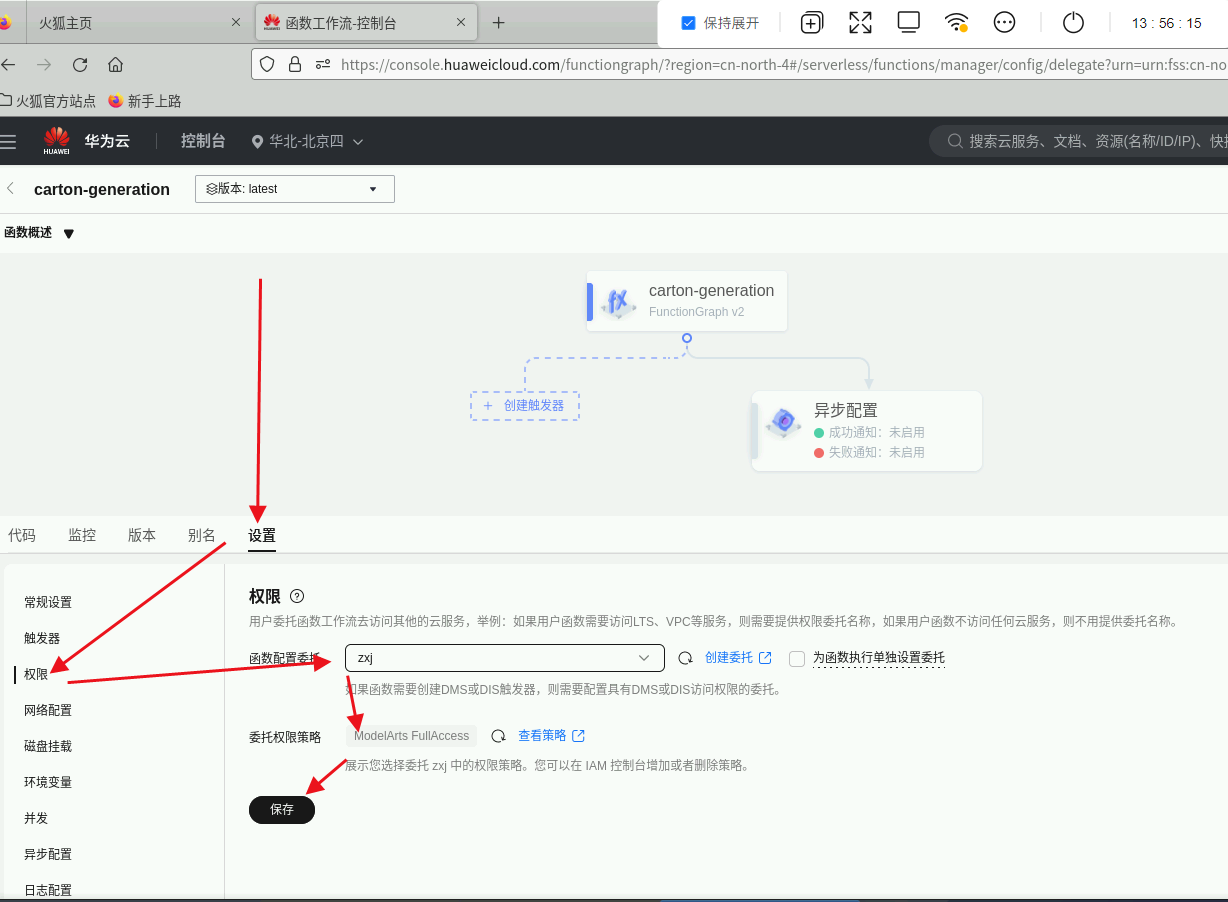 函数配置委托:回到浏览器函数详情界面,点击“设置”,选择“权限”,“函数配置委托”选择提前创建好的委托,点击“保存”。