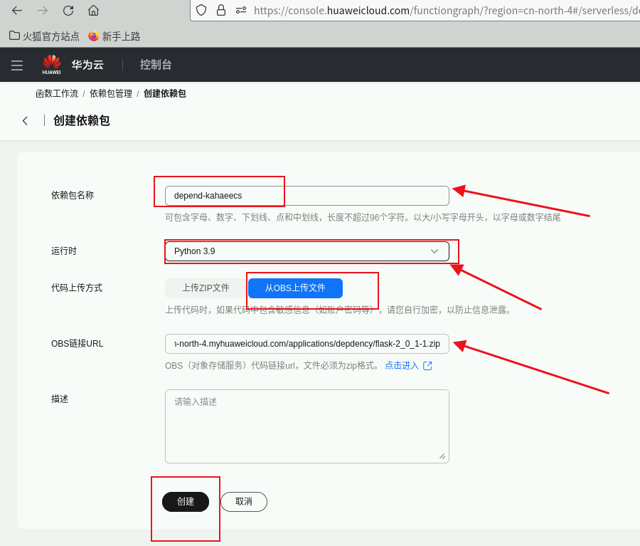 函数添加依赖包2: 填写“依赖包名称”,代码包上传方式为“从OBS上传文件”,将OBS链接粘贴到“OBS链接URL”中(OBS URL:https://functionstorage-cn-north-4.obs.cn-north-4.myhuaweicloud.com/applications/depdency/flask-2_0_1-1.zip )