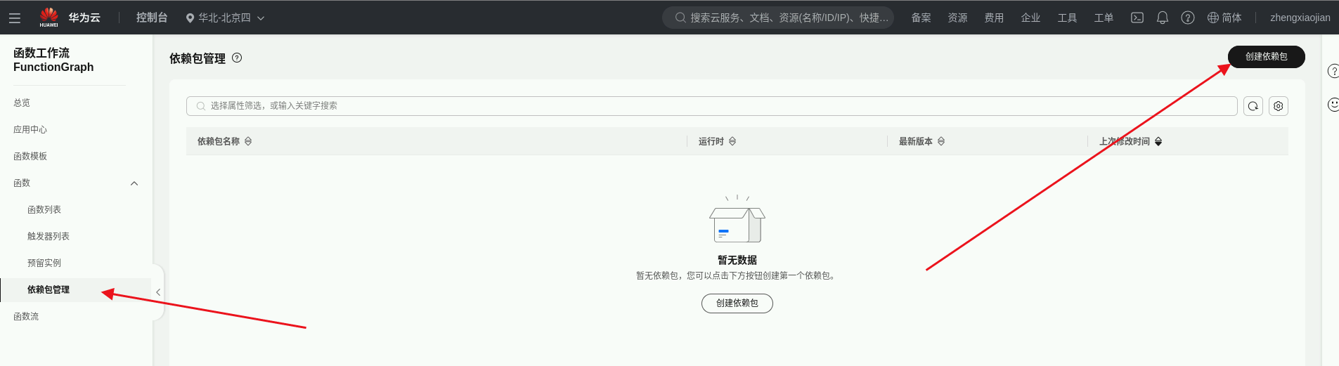 函数添加依赖包1: 返回“函数工作流”管理界面,选择“依赖包管理”,点击“创建依赖包”。
