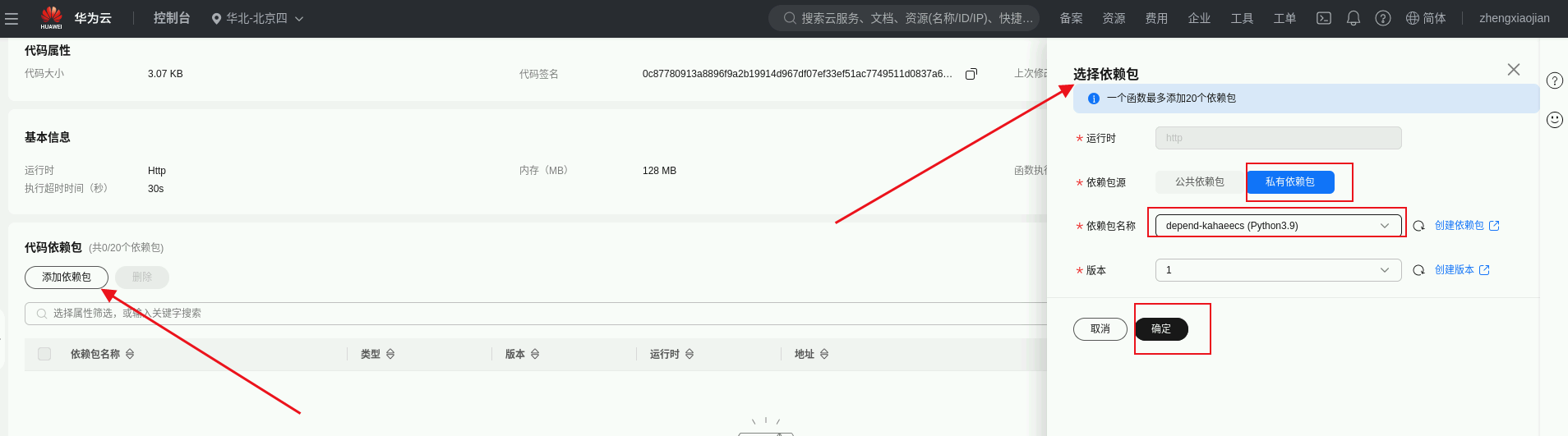 添加依赖包:进入函数详情页底部,点击“添加依赖包”。选择“私有依赖包”,依赖包名称如图所示。