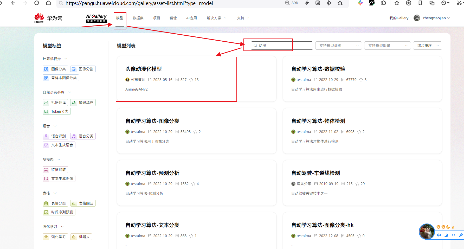 头像动漫化模型:导航栏选择“模型”,搜索框输入“动漫”,选择“头像动漫化模型”。