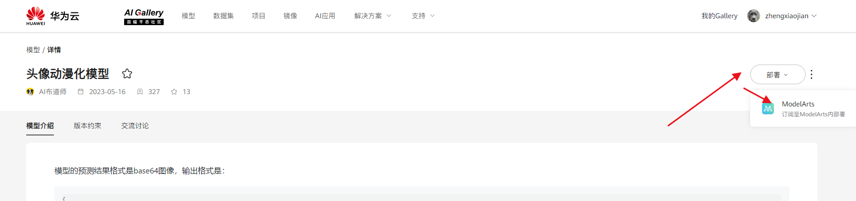 ModelArts部署:进入详情页,点击“部署”,选择“ModelArts”。