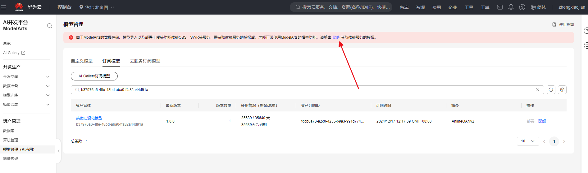 订阅模型并部署AI应用:在华为云控制台点击搜索框搜索“ModelArts ”,点击“ModelArts”,选择“AI Gallery”。