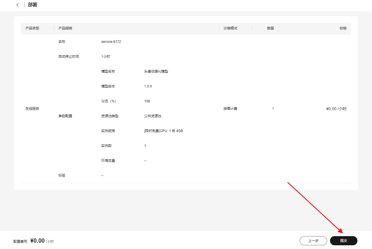 提交部署:点击“提交”(调后需要耐心等待部署进度)。