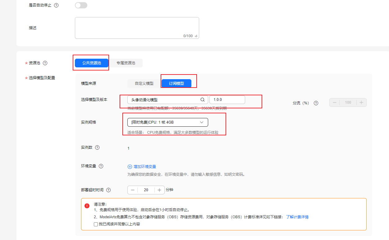 资源配置:资源池选择“公共资源池”,AI应用及配置选择“订阅应用”,选择AI应用及版本,计算节点规格选择“[限时免费]CPU:1核4GB”,勾选“我已阅读并同意以上内容”,点击“下一步”。