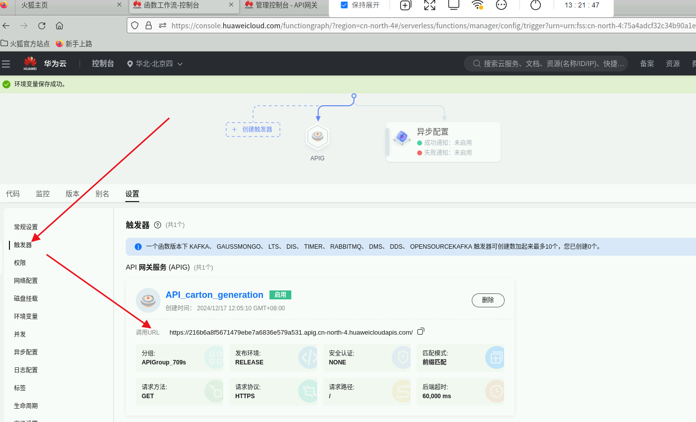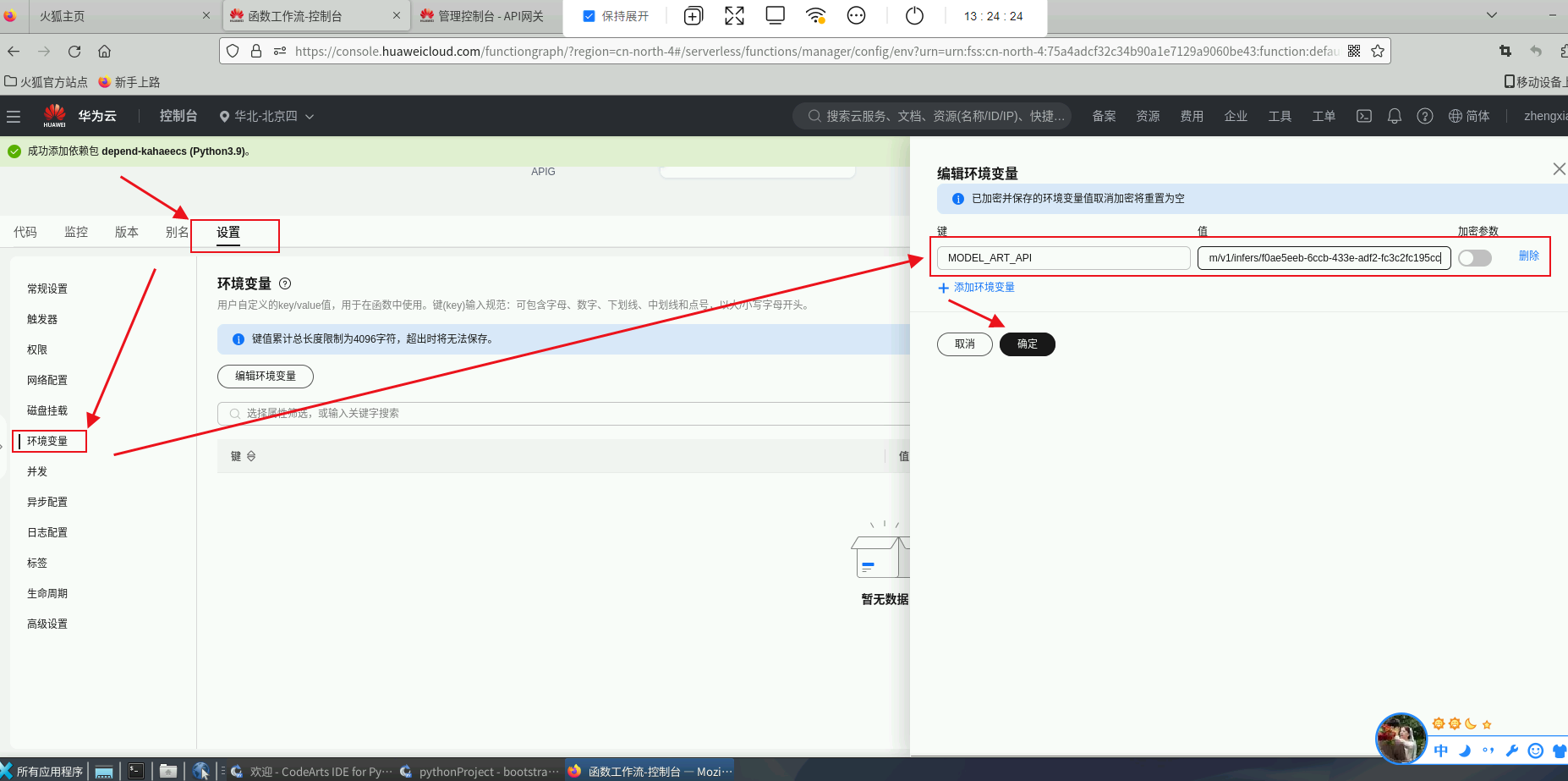 环境变量:回到函数页面,设置环境变量,键:MODEL_ART_API,值:刚刚复制的API接口公网地址。
