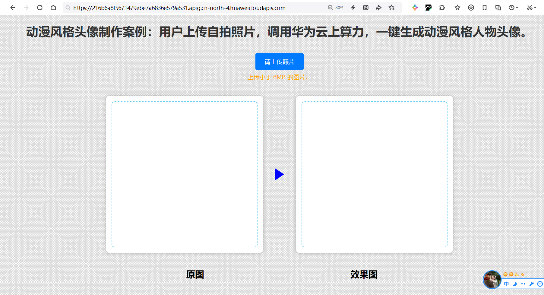 制作动漫头像:到这里函数和AI应用就已经部署好了,可以复制URL到浏览器打开web页面开始制作动漫头像。