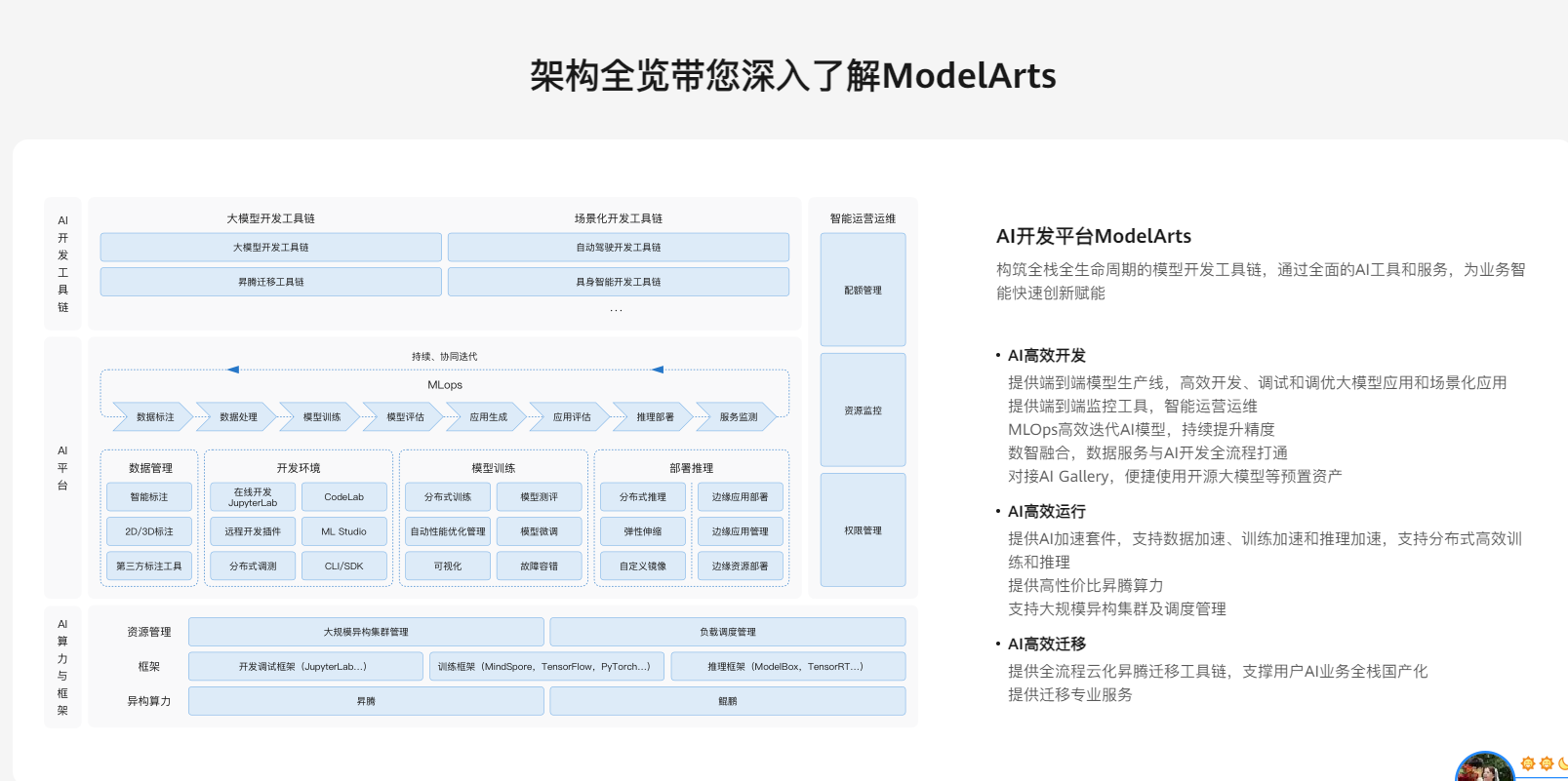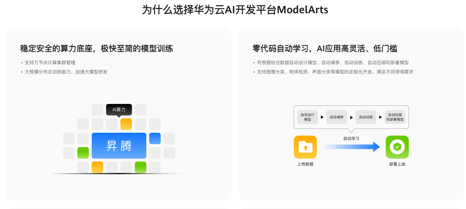 对于像我这样没有深厚机器学习背景的人来说,AI开发往往看起来复杂又难以入手。但是ModelArts提供了一个非常友好的界面和一系列预构建的功能模块,使得即使是对AI了解不多的人也能快速上手。它支持零代码或少量代码完成模型训练,这意味着我可以专注于解决业务问题而不是被技术细节所困扰。此外,平台上提供的自动机器学习(AutoML)功能更是大大减少了模型选择和调参的时间成本,让AI开发变得更加直观和高效。
