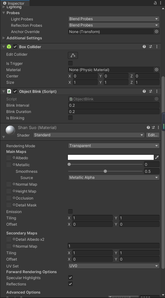 这段代码实现了物体按照设定的间隔时间和闪烁持续时间进行闪烁的效果。通过修改物体材质的透明度(利用 PingPong 函数在 0 到 1 之间循环变化来实现闪烁的视觉效果),来让物体呈现出一闪一闪的样子。