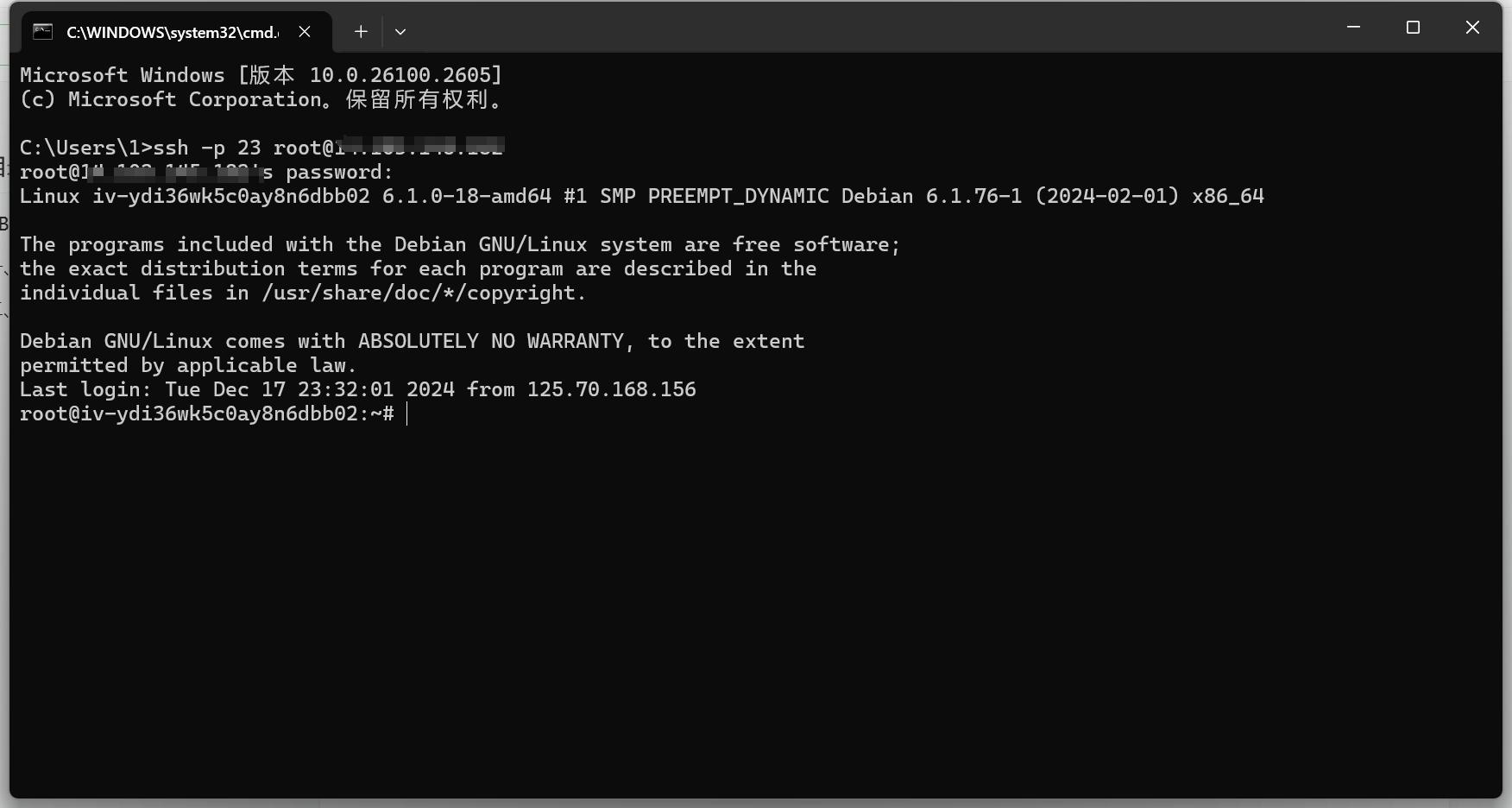 Windows10以上可以使用自带cmd命令行来登录。也可以用最新版本的putty。我测试的环境是Windows11,以下为测试的登录截图。