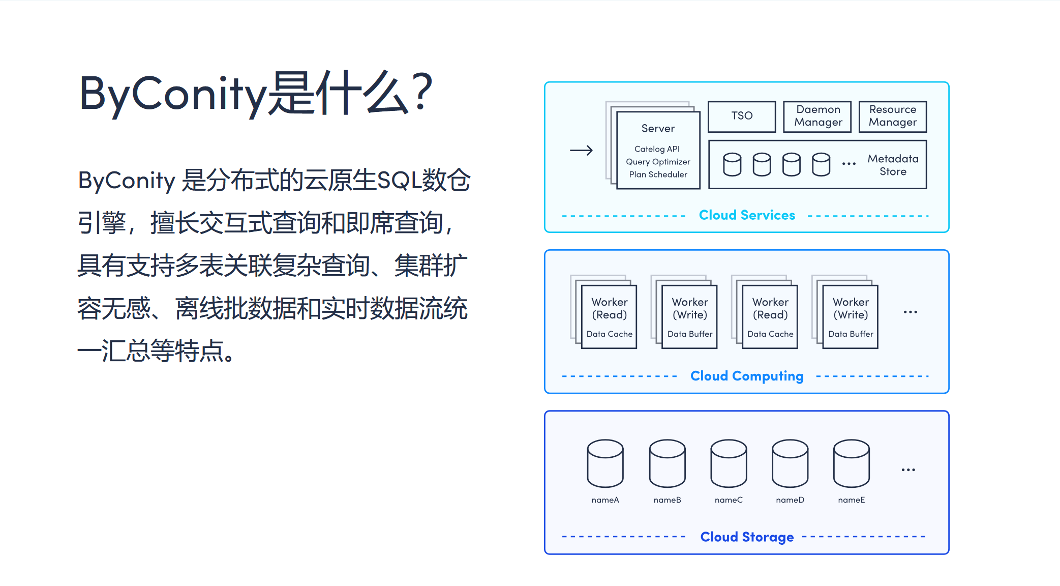 ByConity 是分布式的云原生SQL数仓引擎,擅长交互式查询和即席查询,具有支持多表关联复杂查询、集群扩容无感、离线批数据和实时数据流统一汇总等特点。