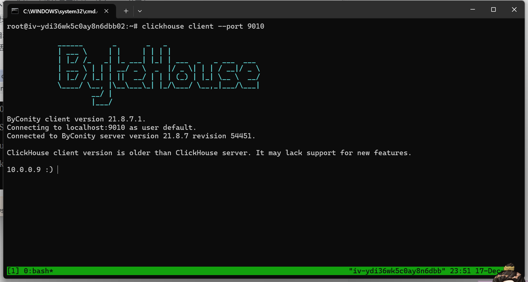 3、执行 clickhouse client --port 9010命令进入客户端。