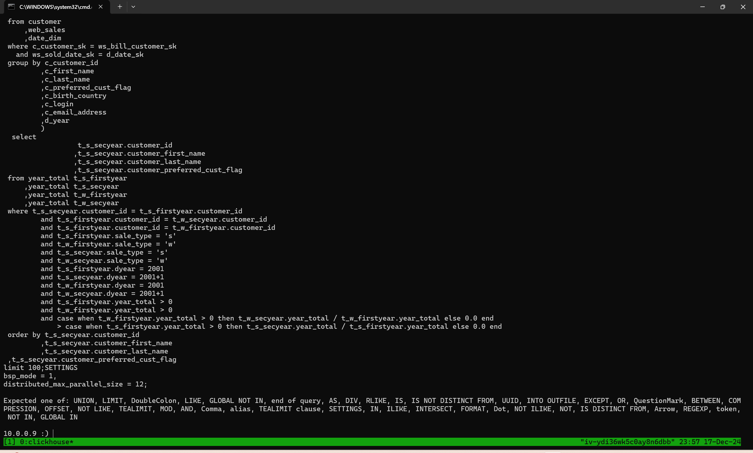 其中参数distributed_max_parallel_size可以设置为 4 的其他整数倍(因为 Worker 的数量为4)。注意要把limit 100后的分号去掉。