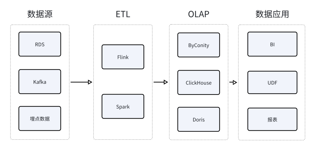 传统的 OLAP 产品通过数据索引、列式存储、向量化执行等技术,注重对实时分析或者 Ad-hoc 分析的快速反应,满足低时延的要求。在数据加载进 OLAP 产品之前,往往需要经过复杂的数据清洗和转换过程,也就是大家熟知的 ETL 任务。在传统的数据分析架构中,这部分工作是由 Hive、Spark、Flink 等产品来完成的。