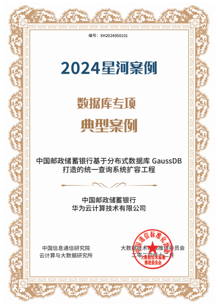 在大会的第八届大数据“星河”案例典型案例证书颁发环节,中国邮政储蓄银行基于分布式数据库GaussDB打造的统一查询系统扩容工程荣获数据库专项典型案例第一名。