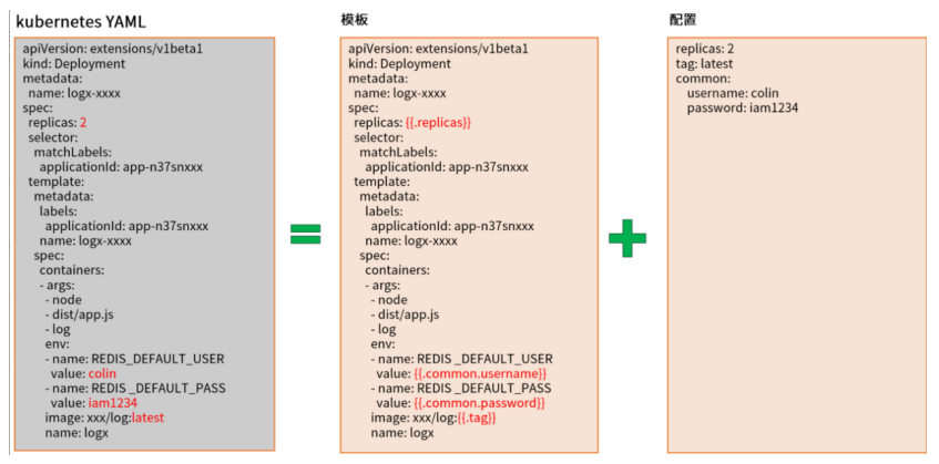 在 Helm 中,可以理解为主要包含两类文件:模板文件和配置文件。模板文件通常有多个,配置文件通常有一个。Helm 的模板文件基于text/template模板文件,提供了更加强大的模板渲染能力。Helm 可以将配置文件中的值渲染进模板文件中,最终生成一个可以部署的 Kubernetes YAML 格式的资源定义文件,如下图所示: