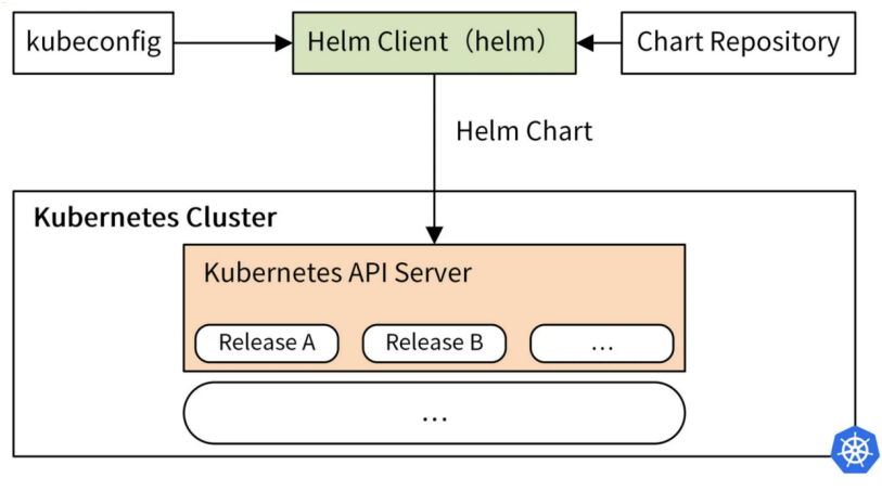 上面的架构图中,核心是 Helm Client(helm命令)和 Helm Chart 包。helm 命令可以从 Chart Repository 中下载 Helm Chart 包,读取kubeconfig文件,并构建 kube-apiserver REST API 接口的 HTTP 请求。通过调用 Kubernetes 提供的 REST API 接口,将 Chart 包中包含的所有以 YAML 格式定义的 Kubernetes 资源,在 Kubernetes 集群中创建。