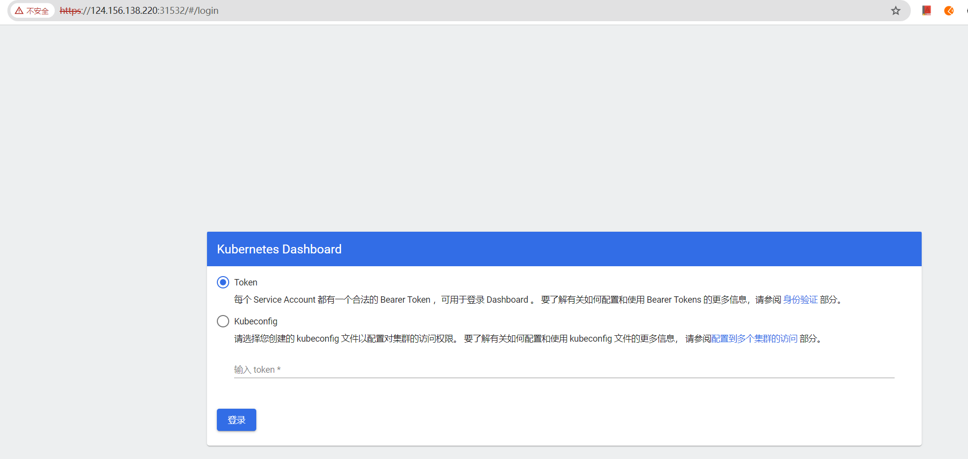 [root@master-01 18-dashboard]# kubectl -n kubernetes-dashboard get svc NAME TYPE CLUSTER-IP EXTERNAL-IP PORT(S) AGE kubernetes-dashboard NodePort 10.110.44.158 <none> 443:31268/TCP 165m